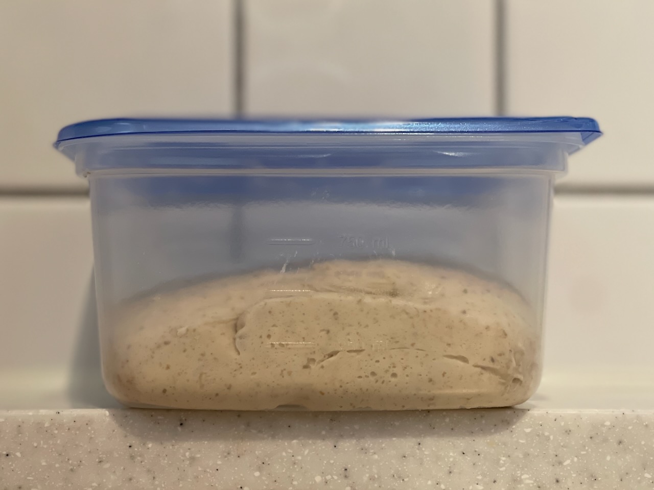 마지막 오토리즈 이후 3절 접기를 하고 발효 용기에 옮긴 뒤, 냉장 발효 전에 실온에서 20분 두어야 했다. 하지만 너무 졸려서 5분만 두고 바로 넣었다.