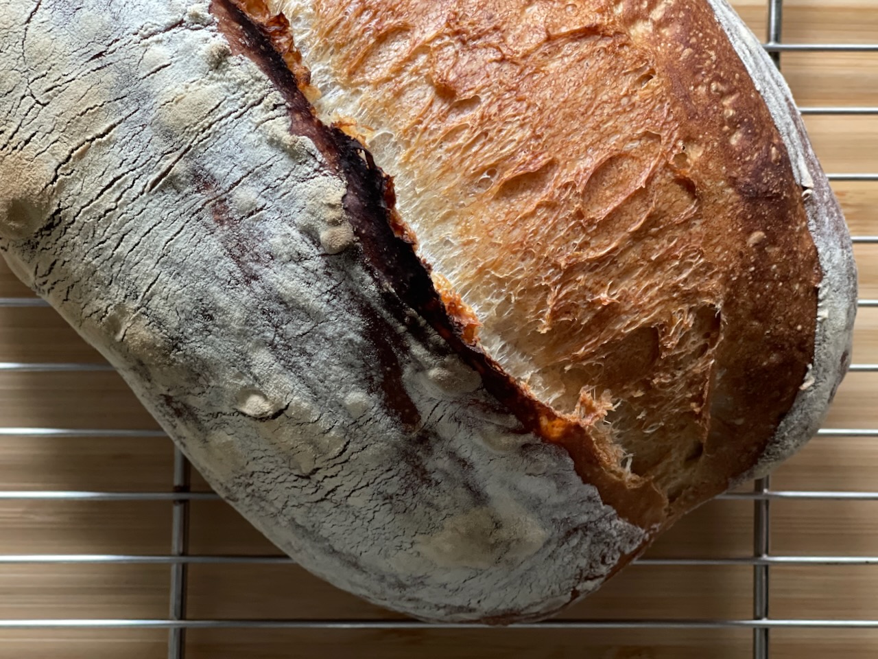 이 캄파뉴는 호밀 15%, 통밀 10%가 들어가 기공이 화려하진 않았지만, 높은 수분율 덕에 촉촉하고 부드러운 사워도우를 완성할 수 있었다.