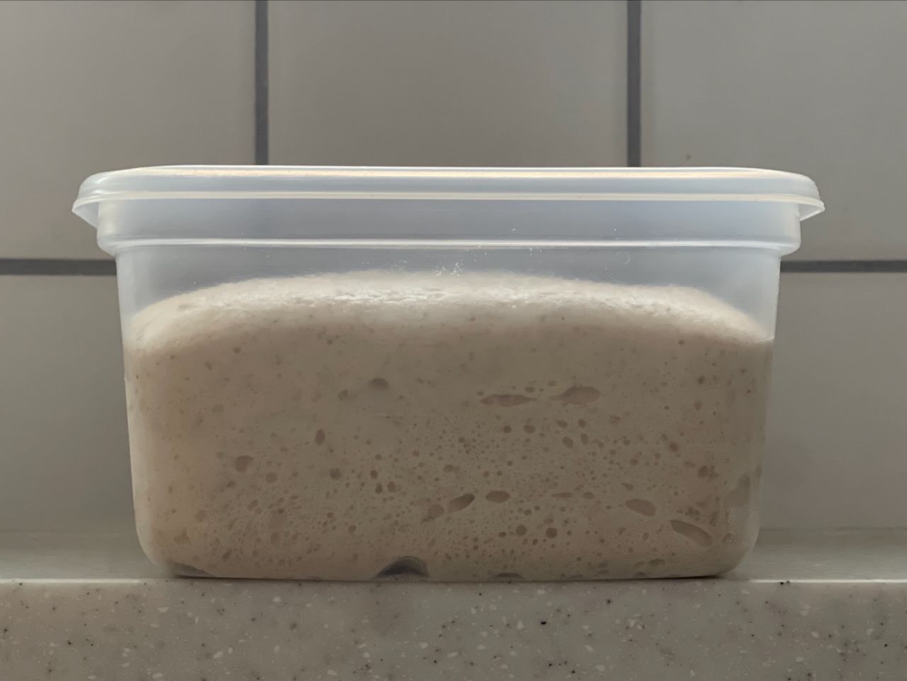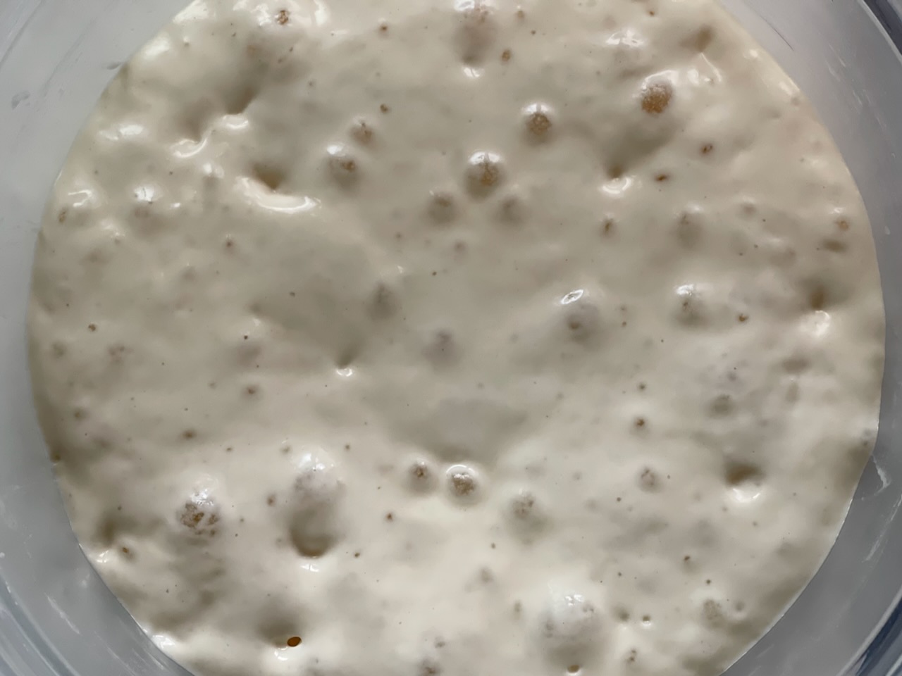나는 실내 온도가 높지 않아 소금은 빼고 만들었고, 대신 본반죽에 소금을 그만큼 추가했다. 기포가 활발히 올라오고 표면에 울퉁불퉁한 크랙이 생기면 발효 피크라고 배웠기에 인내심을 갖고 기다렸다. 피크를 지나버리면 발효력이 약해져 빵이 주저앉을 수 있다.