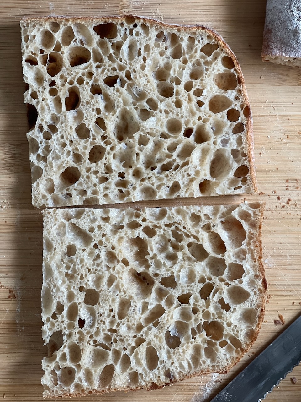 2차 발효는 실온 23도에서 45분 진행했다. 저온 발효실이 없어서 냉장 발효 했을 때는 과발효로 큰 기포들이 많이 보였는데, 이번엔 8도에서 밤새 안정적으로 발효되었는지 적당한 크기의 기공들이 보였고 쿠프칼도 잘 들어갔다.