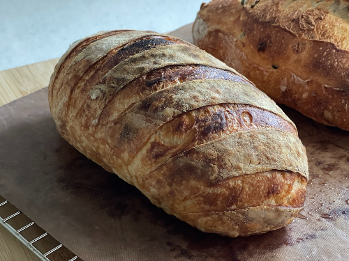 세로로 넣는 일자형 쿠프는 빵을 옆으로 벌어지도록 하고, 사선으로 넣는 쿠프는 빵을 위로 많이 부풀게 하는 역할을 한다고 한다. 빵의 특성에 따라 쿠프 모양을 달리 해서 식감과 맛에 변화를 줄 수 있다는게 흥미로웠다. 사선 쿠프 덕분에 크럼이 가볍게 잘 구워졌다. 지난 번 사워도우 크로아상은 이번보다 중량도 살짝 더 큰데 일자 쿠프를 내서인지 중앙 바닥 쪽이 뭉쳐있는 부분이 있었는데, 이번 깜빠뉴는 바닥쪽도 크고 작은 기공들이 시원하게 터진 모습이다.