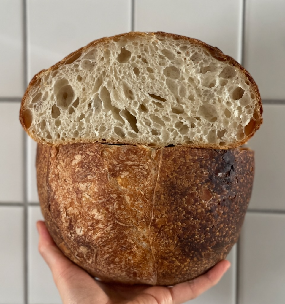 양면 코팅팬 두 장을 겹쳐 250도로 45분간 예열한 뒤, 800g짜리 사워도우를 넣고 큰 스텐볼을 덮어 20분간 구웠다. 오븐 스프링이 일어난 후에는 스텐볼을 제거하고, 230도에서 추가로 25분간 구움색을 내며 수분을 날렸다.