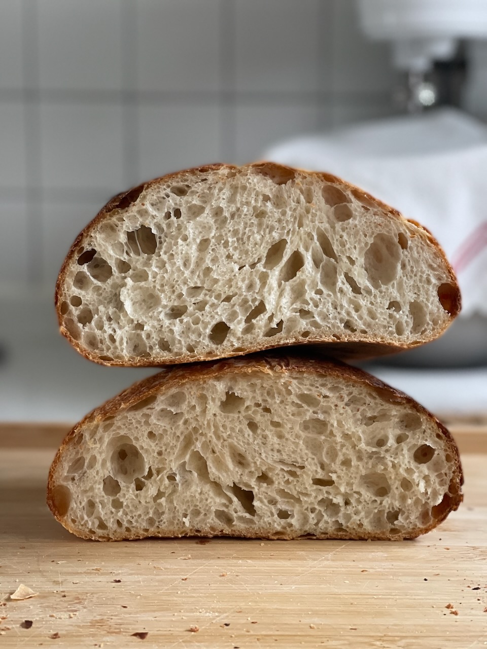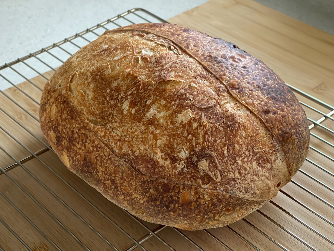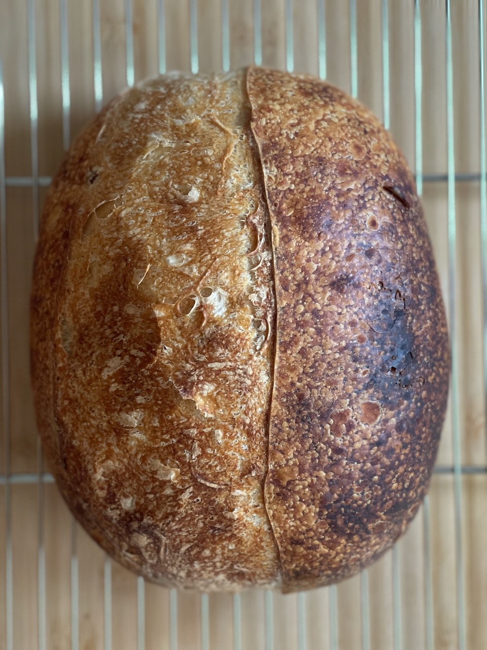 코팅팬 위에서 구운 것치곤 쿠프가 제법 잘 열렸지만, 전체적으로는 납작한 형태. 2차 발효 전에 더 타이트하게 성형했더라면 훨씬 시원하게 터졌을 것 같다는 아쉬움이 남는다.