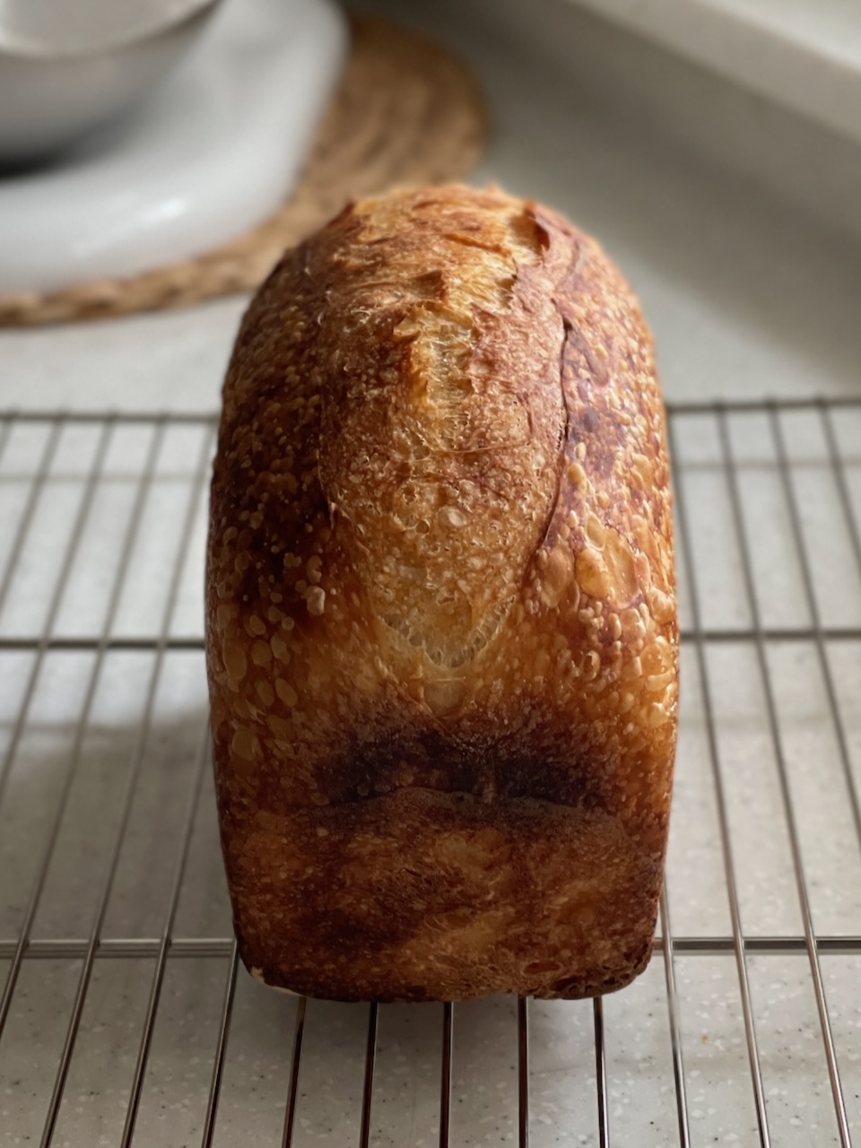 식빵 틀에 사워도우를 구웠을 때의 최대 장점은 스팀 장비 없이도 오븐 스프링을 충분히 기대할 수 있다는 점인 것 같다. 반느통 없이 바로 팬에 팬닝하고 저온 휴지를 거쳐 그대로 굽는 과정이 간단해서 번거롭지 않다. 상하단 열선 모드를 지원하는 오븐이 있다면 베이킹 스톤이나 반느통 없이도 사워도우를 굽는 것이 가능하므로, 로프 팬 사워도우는 사워도우에 입문하는 사람에게도 좋은 선택이 될 수 있겠다.