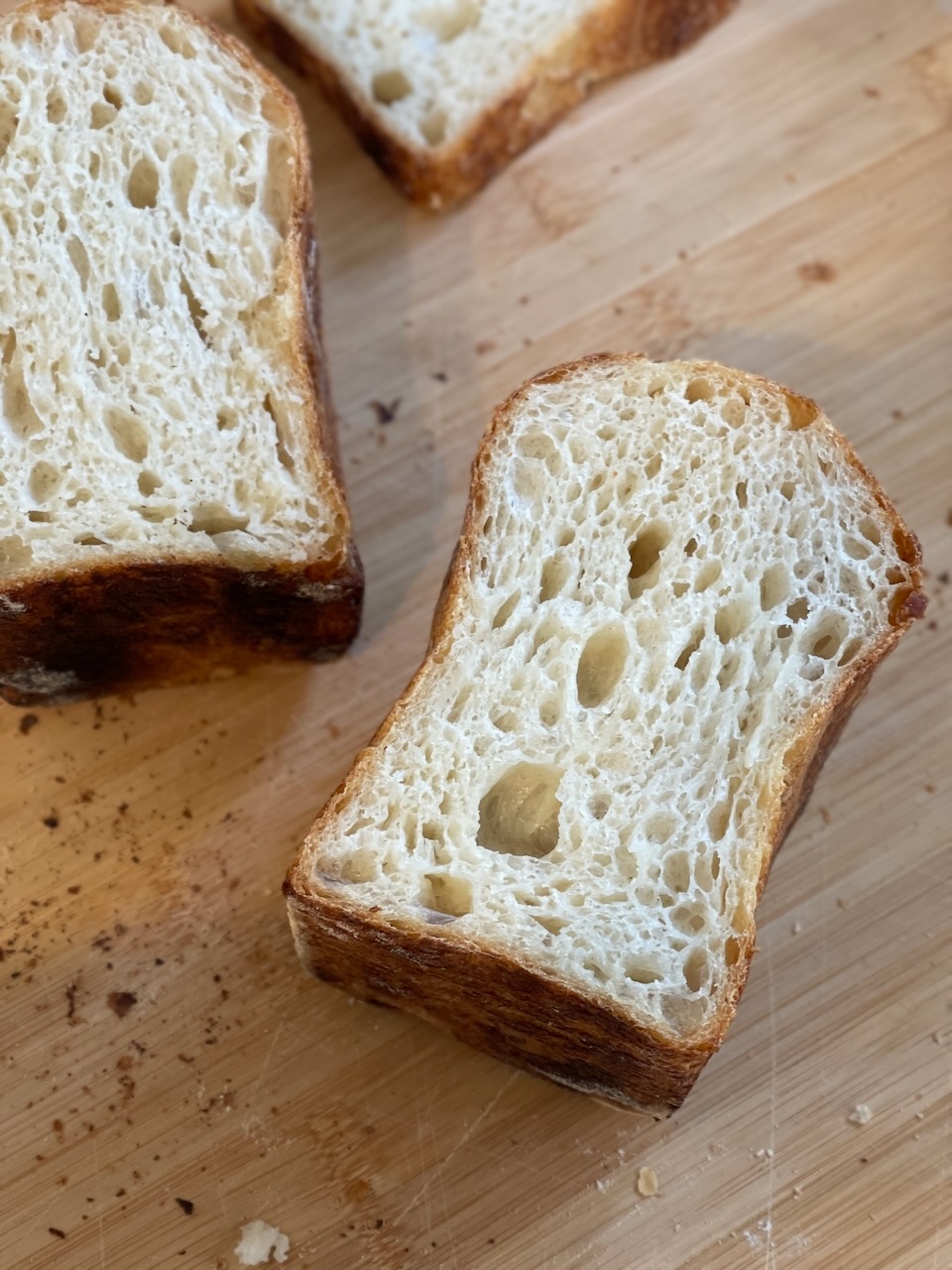 굽고 나서 잠시 외출을 해야 해서 아직 뜨거운 빵을 천으로 감싸둔 상태로 두었더니 옆구리가 수축되었다. 식빵 틀에 굽는 사워도우는 수분을 많이 머금고 있기 때문에 내부 수증기가 빠져나가지 못해 옆면이 수축된 것 같다. 다음부터는 아무것도 덮지 않고 바람이 잘 통하는 실온에서 2~3시간 충분히 식힌 뒤 써는 게 좋겠다.