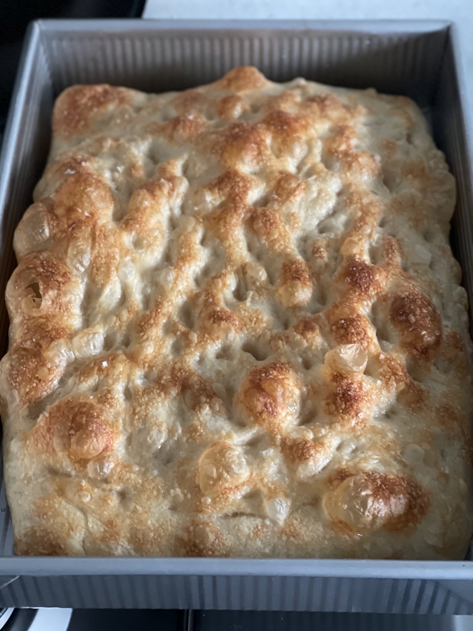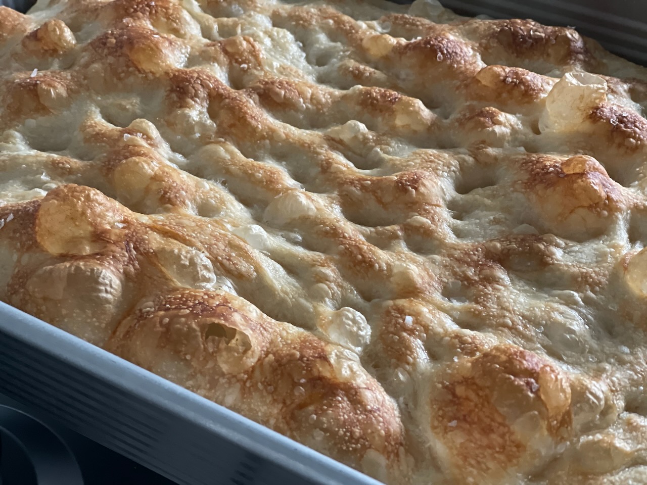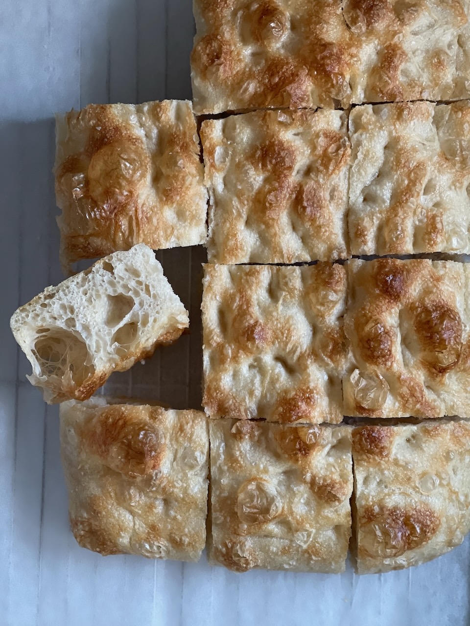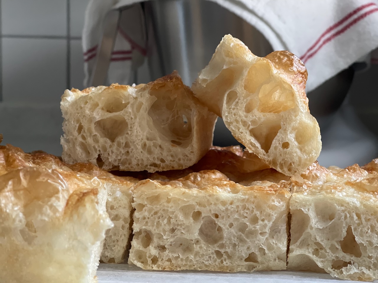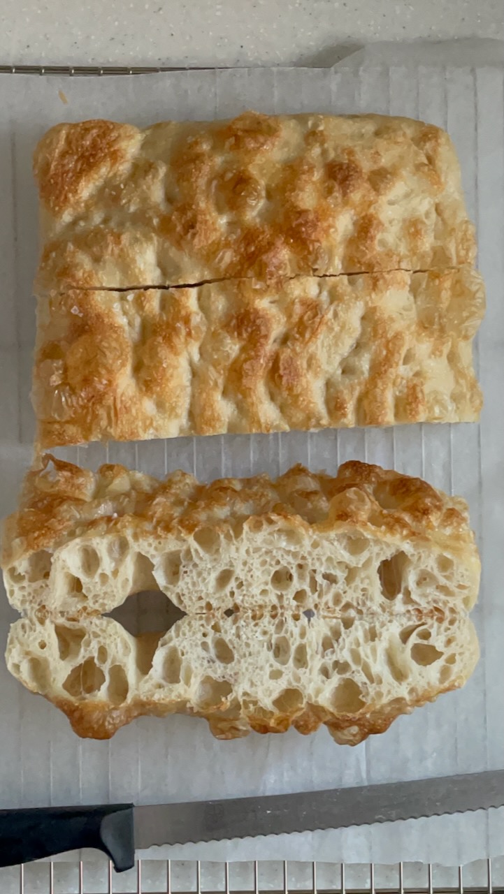 높은 온도에 짧게 구워 겉은 바삭하고 고소하고, 속은 퐁신퐁신한 포카치아.